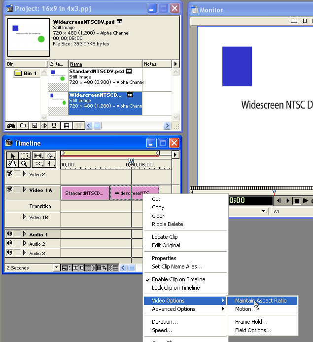 5) Notice that after the change, the aspect ratio now shows "1.2". Also, the preview now shows a more correct display of the clip. Now drag the clip to your timeline. To have Premiere automatically add the letterbox, you need to turn on the "maintain aspect ratio" option for all the clips that do not match the aspect ratio of the project. In this case, the widescreen clip. Right click the clip on the timeline, and select "Video Options -> Maintain Aspect Ratio"