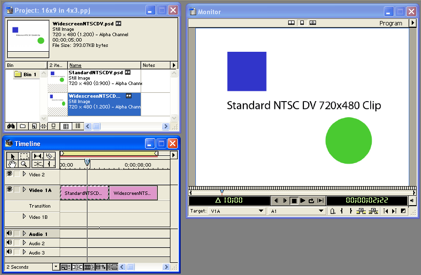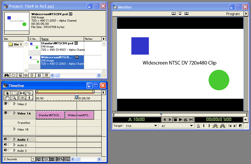 2) Import you footage into your project. Note that the pixel aspect ratio will be displayed beside the image size. Below, Premiere thinks that both are standard DV clips (still images in this case). The "WidesceenNTSCDV.psd" clip needs to be changed so that Premiere knows that it is a widescreen clip. Note that the preview in the top of the window, the square and circle are note quite square and circular.